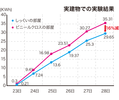 無添加住宅の「オリジナル漆喰」が、下記冷房におけるエアコンの消費電力量を削減する「省エネ性能」を合わせ持つことを、実建物を使った測定実験で検証し、結果一般的なビニールクロス内装仕様の居室が約16%の省エネ効果があることが実証されました。