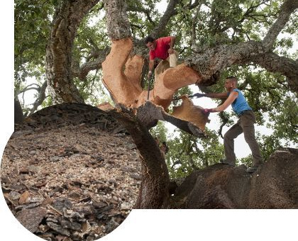 コルク樫の寿命は約200年ですが、これを伐採せず、羊の毛を刈るように丹念に樹皮だけを剥ぎ取ります。コルク樫は再生力が強く、約9年のサイクルで樹皮が再生し、トータルで約20回も採取することができるエコロジーな素材です。また採取した樹皮の中でも商品にならないバージンコルクや、ワイン栓に使うコルクの残りなどを廃棄利用し、細かく砕き、熱で固めて成型し、断熱材として利用することで、資源を有効に活用しています。