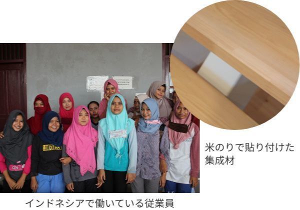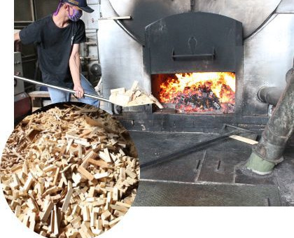 インドネシアの提携工場では米のり集成材を製造する際に出る端材を、木材の防虫・防カビ処理の機械(高温釜)の燃料に再利用し、資源の有効活用を図っています。