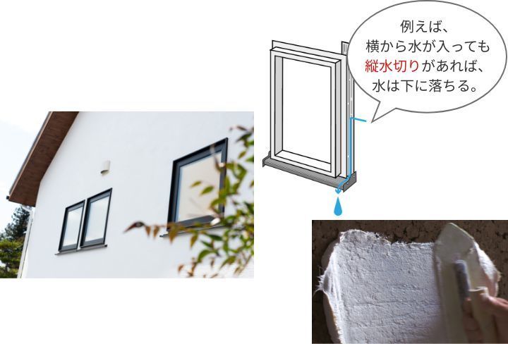 外壁は漆喰と炭化コルクを組み合わせた「漆喰塗り炭化コルクWALL」の工法なので、一般的なサイディングの壁のように継ぎ目がないことから、太陽光の紫外線により約10 年しか持たないシーリング材が不要です。さらに、漆喰は年月が経つほど元の固い石灰石に戻り、強固になっていきます。そのうえ、炭化コルクは無機質なので腐ることもありませんし、漆喰・炭化コルクともに通気性がよいので、通気工法のような複雑な工法も必要ありません。また、サッシ周りには、万が一壁に水が入ってもそれを外に排出する独自の工法(特許取得済)も採用しています。以上のことから素材や工法により長寿命な家を実現することができるのです。