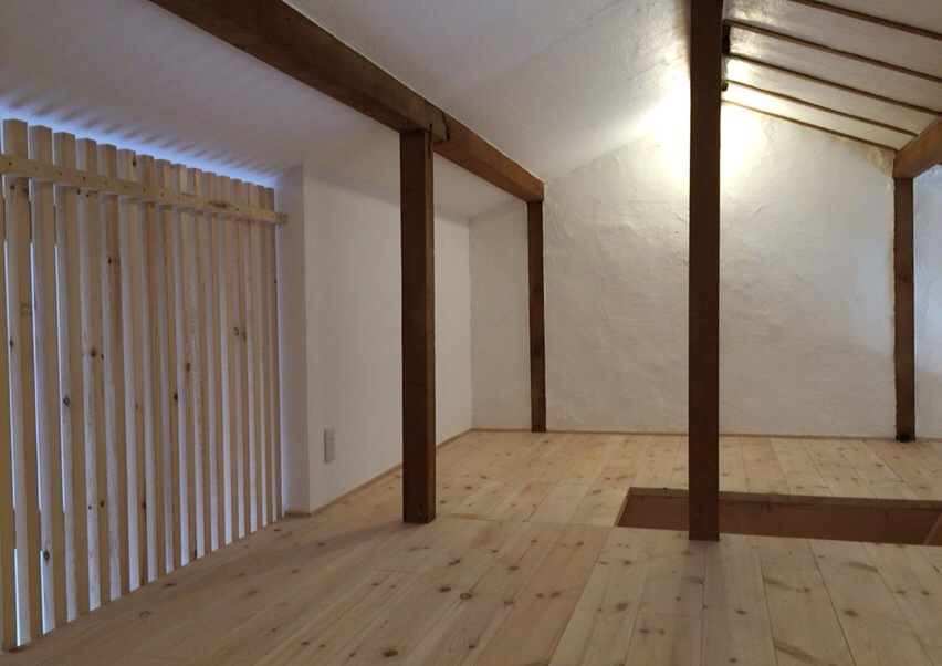 The floor is finished with natural pine redemption, the walls are additive-free plaster, and the ceiling is a very organic space with natural pine, and a wash basin made of natural granite wash counter and enamel bowl.