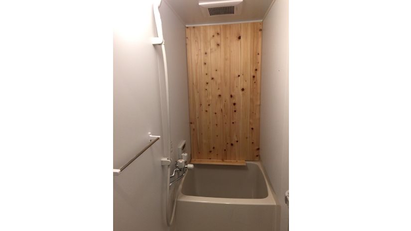 There is a bathtub and shower for one person, and the walls are finished with natural cypress, so you can enjoy the organic aroma.