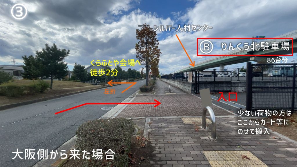 大きい車または少ない荷物の方は一旦、おすすめ参考駐車場のBりんくう北駐車場で停車して、台車等で運搬してください。