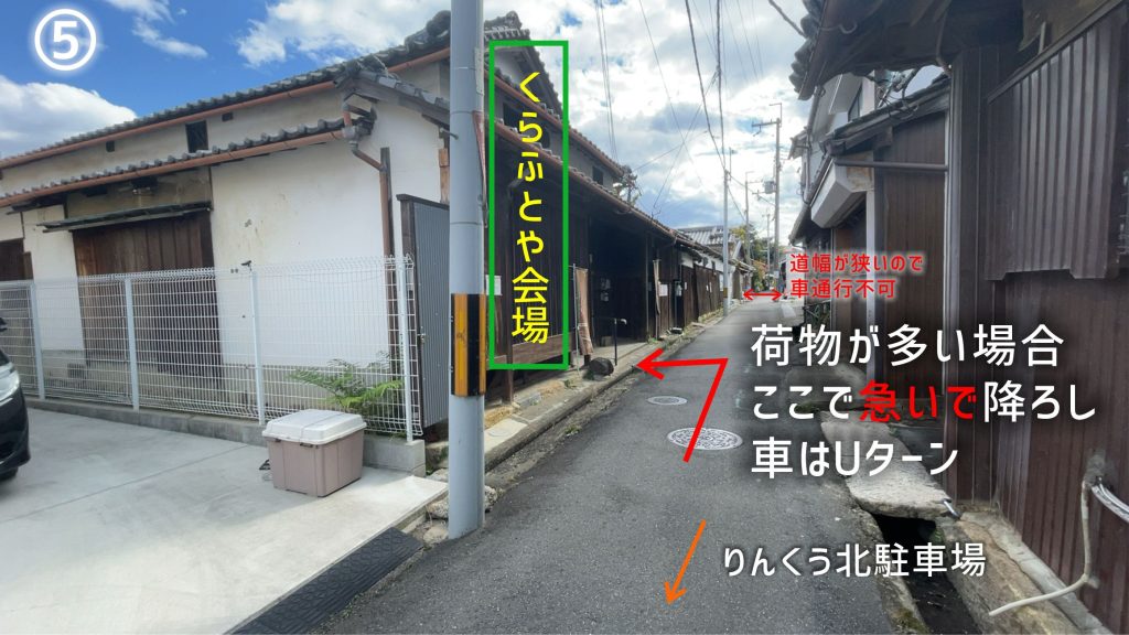 こちらの会場は、道幅がとても狭いので、軽乗用車でしたら、会場前まで可能ですが、先はもっと幅が狭いので、通り抜けできません。たくさん同時に入ると、身動きがとれなくなります。