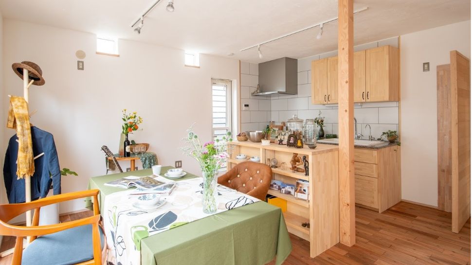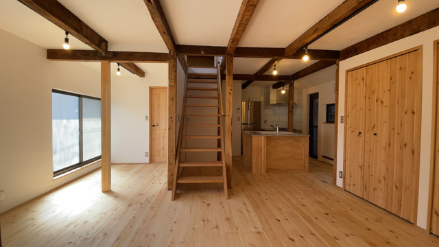室内の特長はリビングに配置した2帖ほどの畳コーナーで、上を見上げると、階段ホールの吹抜けとリビングとが一体となった大空間を味わうことができる。また、将来ピアノ教室を開くことができるように1室のみ自然素材で防音性能を最大限に引き上げている。